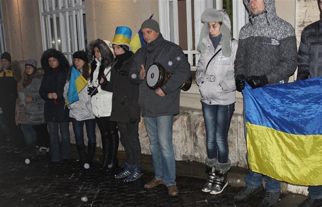 Перед будівлею Закарпатської ОДА зібралося близько 100 студентів. Вони утворили живий коридор перед входом, били в бубен та монотонно повторювали «Ставайте поруч з нами».