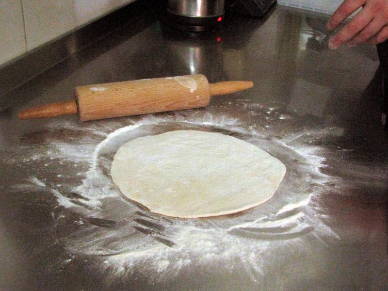 «Треба взяти 200 грамів дріжджового тіста. Розкатати, аби вийшов правильний круг. Перша частина страви готова. Готове тісто перекладаємо на пательню, — пояснює шеф-кухар. — Друга частина: беремо велику миску, розбиваємо яйце і додаємо сюди 370 грамів сиру і викладуємо на підготоване тісто. Після цього по всій ширині круга треба витягнути краї тіста, аби закрити ними сир. Невеликий отвір зверху треба залишити».