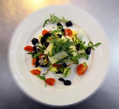 Спочатку до келиха викладають руколу. Варто зазначити, що рослина дуже корисна, хоча за певну гірчинку у смаку чимало людей недооцінюють її. Натомість рукола здатна навіть побороти ракові захворювання. Після руколи викладають пармезан, шматочками чи натертий на терці. Затим оливки чорні без кісточок, нарізані на дрібні шматки, та помідори черрі.