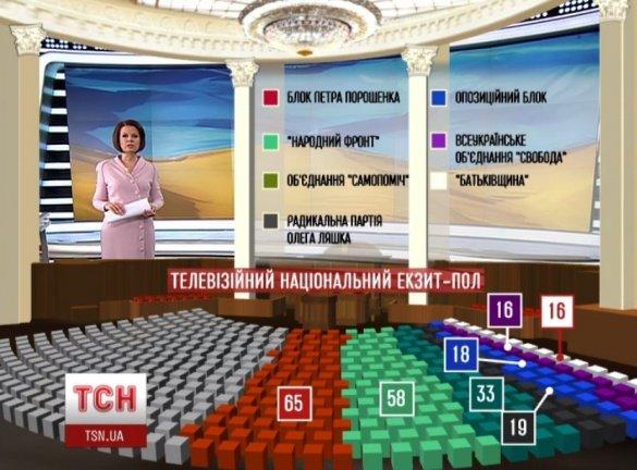 Редакція ТСН, ґрунтуючись на остаточних даних екзит-полів, підрахувала приблизну кількість крісел, у які сядуть представники партій, що подолали прохідний 5-відсотковий бар'єр, не включаючи самовисуванців та мажоритарників.