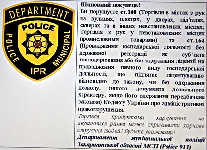 Такі попередження «муніципальна поліція» (Police 911) роздаватиме на стихійних «вуличних» ринках. У самій листівці «продавця», який торгує на вулиці без будь-яких документів просто неба попереджають про ст. 160 та ст.164 Кодексу України про адміністративні правопорушення. Також Департамент підготував подібні листівки-застороги для гіпотетичних покупців, для того щоб вони дбайливіше ставилися до того де і що вони купують. Адже якщо зникне попит, то і відповідно – пропозиція. Таким чином, «муніципальна поліція» (Police 911) хоче спочатку попередити продавців-порушників, а уже потім разом з муніципальною поліцією складати адміністративні протоколи, які потім будуть направляти в адмінкомісії та суди.