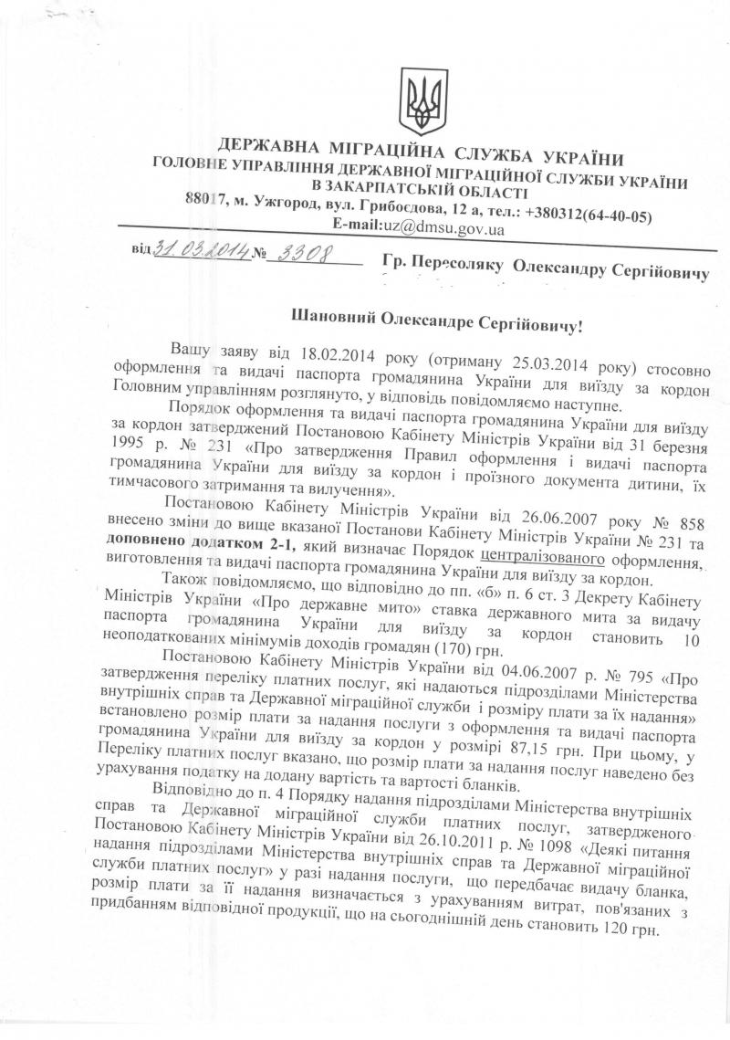 Ставка держмита за видачу паспорта громадянина України для виїзду за кордон становить 170 гривень (Декрет Кабінету Міністрів України від 21.01.1993 №7-93 “Про державне мито”). Чинна Постанова Кабінету Міністрів України № 795 (в редакції Постанови КМУ від 26.10.2011 №1098 ) визначає вартість адмінпослуги з оформлення та видачі закордонного паспорта у розмірі 87,15 грн. та 120 грн. - за бланк паспорта. Також відзначається, що згадане активістами в усному зверненні рішення Верховного Суду України не визначає змін до переліку або розміру обов’язкових платежів при оформленні паспорта громадянина України для виїзду за кордон, встановлених чинними актами законодавства, а лише залишає в силі попередню постанову Вищого адміністративного суду України, якою він зобов’язав територіальний орган міграційної служби повторно розглянути заяву громадянина Б., а не оформляти йому документ без сплати всіх передбачених законодавством платежів.