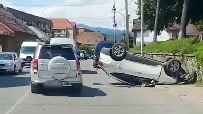 У Хусті припаркована на пагорбі автівка з’їхала вниз і перекинулася на дах