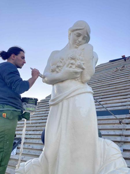 Дуже радує, що фахова реставрація торкнулася й жіночої скульптури на даху вілли. Провели її реставратори Закарпатського обласного краєзнавчого музею ім. Т. Легоцького Ян-Павло Роман і Роман Мурник. Коли вони побачили фігуру вперше, зрозуміли, що прийшли дуже вчасно, адже в кількох місцях вона мала серйозні пошкодження, через які всередину пустої до пояса скульптури затікала вода. У вересні реставратори стали до роботи: почистили фігуру, заповнили тріщини спеціальною сумішшю, стягнули стінки кріпленнями, відновили втрачені деталі. Тепер бетонна з мармуровою крихтою дівчина буде міцно стояти на даху вілли ще багато років.