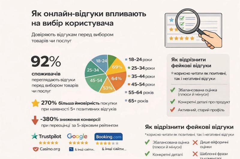 Онлайн-відгуки вже не є «додатковою думкою» — для багатьох людей вони стали основним джерелом інформації при виборі послуг, товарів чи реєстрації в онлайн-казино. З підвищенням популярності відгуків зростає й кількість маніпуляцій: ідеальні оцінки без конкретики, масовані повторювані коментарі, «прибрані» негативні відгуки або явна реклама. Саме тому важливо не лише читати відгуки, а й вміти їх аналізувати: звертати увагу на актуальність, збалансованість думок, надійність джерел, реакцію бренду та підтвердження реального досвіду. У цьому матеріалі я розповім про те, як відгуки справді впливають на прийняття рішень. Обговорю важливість перевірки кількох платформ, які сайти можуть допомогти вам обрати надійні казино або послуги для подорожей і техніки. Також наведу поради щодо того, як відрізнити справжні коментарі людей від фальшивих.
