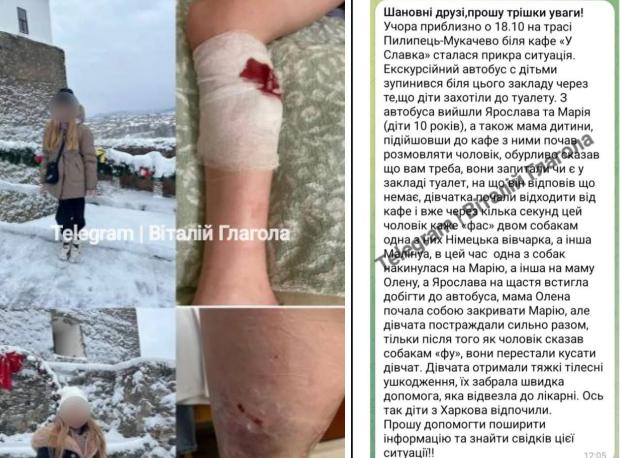 "Екскурсійний автобус зупинився через те, що діти захотіли до вбиральні. Двоє 10-річних дівчат та мати однієї із них попросилися до вбиральні, але власник закладу грубо відмовив їм у користуванні, навіть за гроші...Коли діти пішли в обхід, щоб сходити за потребою десь у лісі, чоловік сказав "Фас!" своїм двом собакам. Очевидці стверджують, що чули саме цю команду, власник це заперечує.