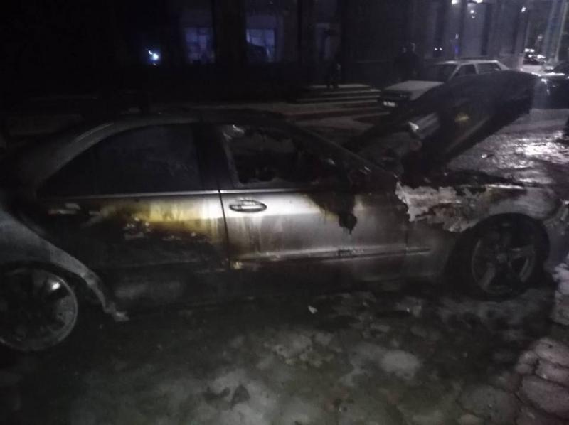 Цього разу загорівся Мерседес Бенц. Це сталося сьогодні вночі на площі Хмельницького. Пожежники загасили вогонь, але автівка все одно сильно постраждала.