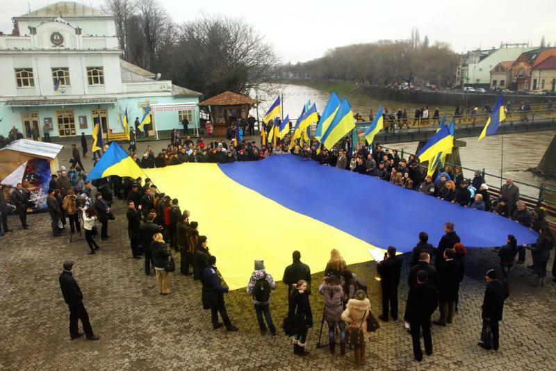На пл. Театрольній в Ужгороді в рамках святкування Дня Соборності України активісти і представники різних політичних сил розгорнули великий український прапор.