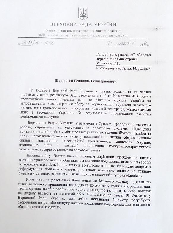 Комітет з питань податкової та митної політики Верховної Ради України надіслав відповідь голові Закарпатської ОДА Геннадію Москалю щодо запропонованих ним змін до Митного кодексу України, які могли б вирішити актуальне для прикордонних областей питання так званої «пересічки». Пропозиції були напрацьовані спільно з активістами, які тривалий час намагаються вирішити проблему перетину кордону кожні 5 або 10 днів громадянами України, що користуються автомобілями з іноземною реєстрацією. Надаємо відповідь Комітету нижче.