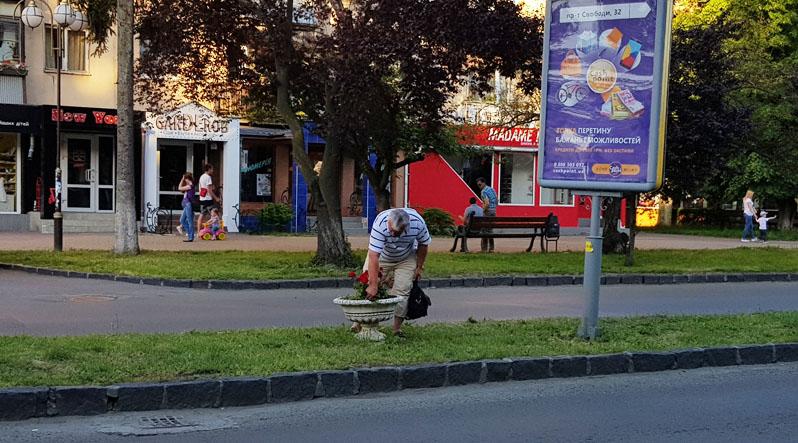 Гарно і акуратно одягнений чоловік ішов кудись проспектом Свободи. Раптом він підійшов до квіткового вазону і почав над ним «чаклувати».