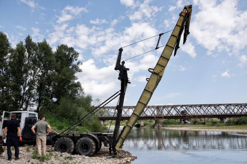Підрозділи ДСНС і дорожні служби розпочали роботи зі встановлення тимчасової переправи з комплекту важкого механізованого моста ТММ-3 для легкових автомобілів. Встановлено першу секцію мосту у районі зведення переправи.