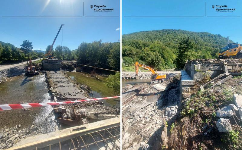 Процес демонтажу аварійного мосту через річку Жденівка, який впав у червні поточного року у Закарпатській області вийшов на завершальну стадію. Вже розібрані верхні конструкції переправи, проводяться підготовчі роботи до монтажу нового мосту.