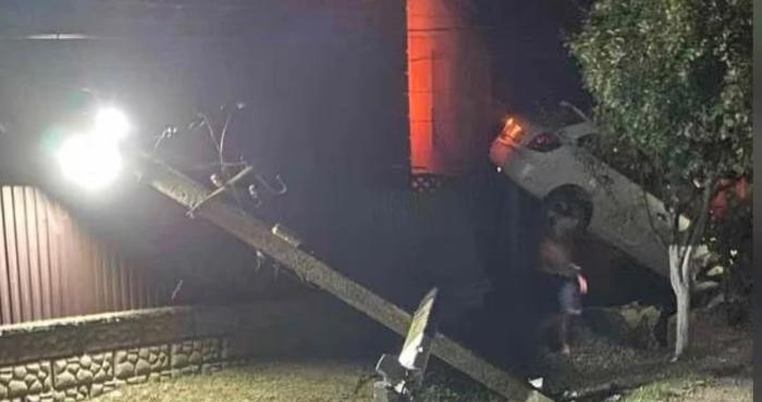 Від удару автомобіль підкинуло і він опинився на паркані. Постраждалих в аварії немає. Через пошкоджену електроопору частина населеного пункту залишилася без електроенергії.