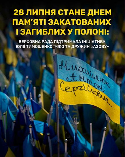 28 липня став Днем памʼяті закатованих і загиблих у полоні: Верховна Рада підтримала ініціативу Юлії Тимошенко, МФО та дружин «Азову».