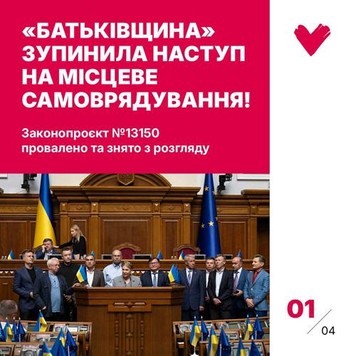 Завдяки зусиллям фракції «Батьківщина» у Верховній Раді були зупинені наміри провладної більшості посилити в країні авторитаризм і позбавити місцеве самоврядування свободи в ухваленні рішень, а законопроєкт №13150 був «провалений» та знятий з розгляду.