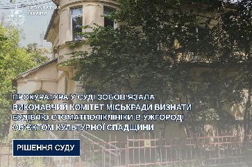 За доводами прокуратури у судах першої та апеляційної інстанцій зобов’язано виконком Ужгородської міської ради визнати будівлю стоматполіклініки в історичному ареалі м. Ужгорода щойновиявленим об’єктом культурної спадщини.