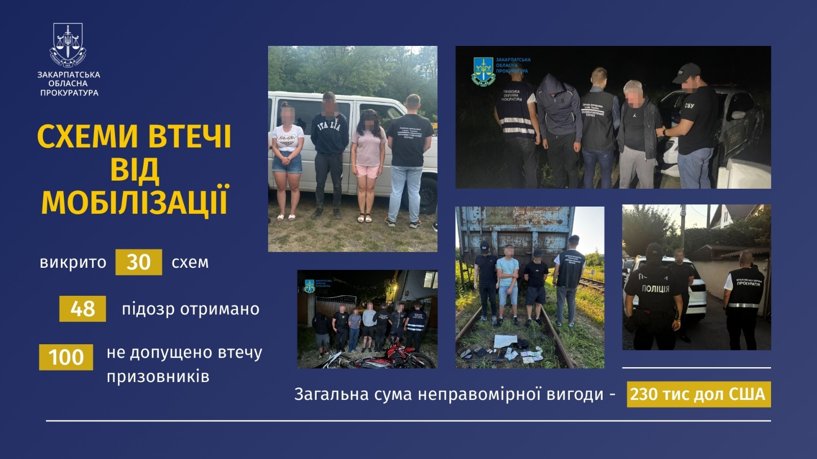 Лише з 1 липня, на Закарпатті скоординовано викрито понад 30 каналів втечі від мобілізації. Повідомлено про підозри 48 організаторам та їх спільникам, 44 з яких взято під варту. У рамках цих кримінальних проваджень не допущено втечу понад 100 військовозобов’язаних. Загальна сума неправомірної вигоди, яку розраховували отримати зловмисники складає майже 230 тис дол. США.