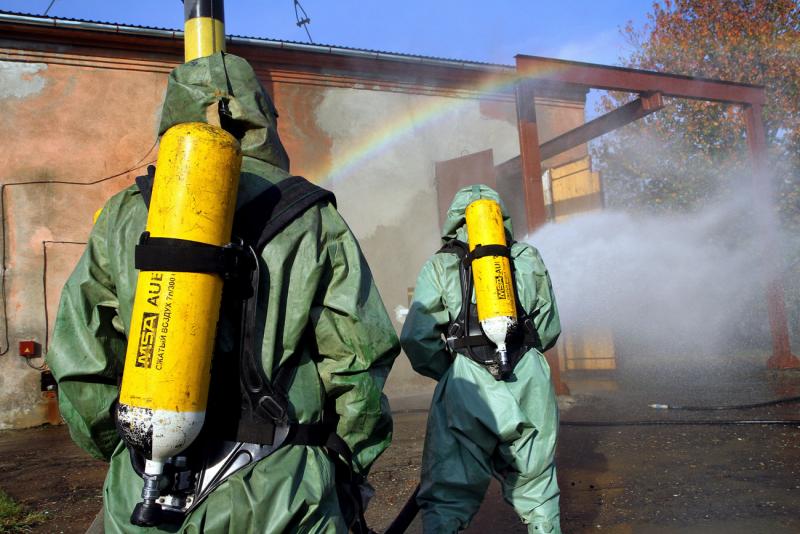 Далі за роботу береться група радіаційного та хімічного захисту. Рятувальники одягають спеціальні захисні костюми, засоби індивідуального захисту органів дихання та вирушають на розвідку ситуації. Вони оцінюють кількість вивільненого хлору, напрямок та силу вітру і зону імовірного зараження, доповідають штабу та формують зону обмеженого доступу та проводять заходи евакуації із зони населення. Вогнеборці ліквідовують пожежу та проводять аварійно-відновлювальні роботи.