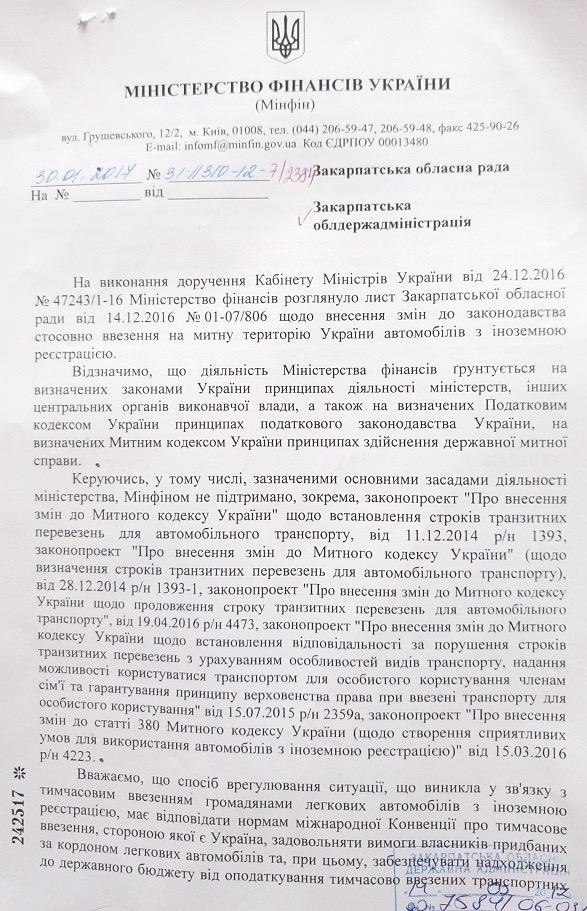 «Вважаємо, що спосіб врегулювання ситуації… має відповідати нормам міжнародної Конвенції про тимчасове ввезення, стороною якої є Україна, задовольняти вимоги власників придбаних за кордоном легкових автомобілів та при цьому забезпечувати надходження до державного бюджету від оподаткування тимчасово ввезених транспортних засобів», – йдеться в листі за підписом заступника міністра фінансів Євгена Капінуса. Разом із тим, за результатами засідань робочої групи з урегулювання ситуації на розгляд Верховної Ради України подано законопроект за №5567 від 21 грудня 2016 року – «Про внесення змін до Митного кодексу України (щодо врегулювання транзиту та тимчасового ввезення транспортних засобів особистого користування)», який спрямовано на вирішення питання «пересічки».