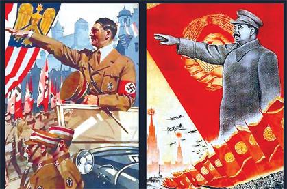 І все ж тоталітаризм жорстокий однаково. Жертвами Сталіна стали на 20 мільйонів людей більше, ніж жертвами Гітлера. Ці два тирани мов би змагалися між собою в кровожерстві. І навіть ідеологічна машина в них була однакова. Достатньо порівняти агітаційні плакати сталіністів та гітлерівців. Вони ідентичні.