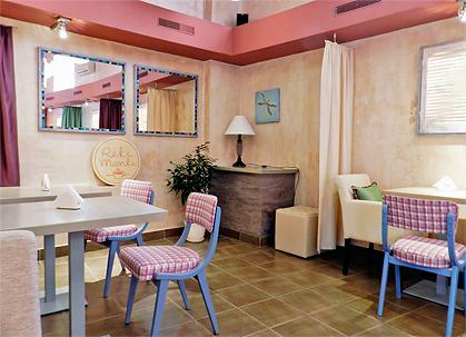 Над інтер’єром працювали професійні дизайнери, які додали пастельної кольорової гами і попрацювали над деталями. Що втішно — у кав’ярні просторо, столики відгороджені симпатичними ширмами, що сприяє спілкуванню тет-а-тет. Кольорові зручні стільці та крісла, дивани з яскравими і м’якими подушками, мозаїка, картини, тумба з книгами та журналами (до речі, тут є що почитати), імітація вікон, настільна лампа, дошки зі смачними пропозиціями над бар-стійкою... Загалом, все оформлено у мінімалізмі з романтичним духом. Ненав’язлива, фонова музика зовсім не докучає спілкуванню за кавою. Тераса хоч і невибаглива, зате весь шарм у провулку, де розташувалася кав’ярня. Часом ввечері власники вмикають на терасі лампу і ви опиняєтеся у казці.
