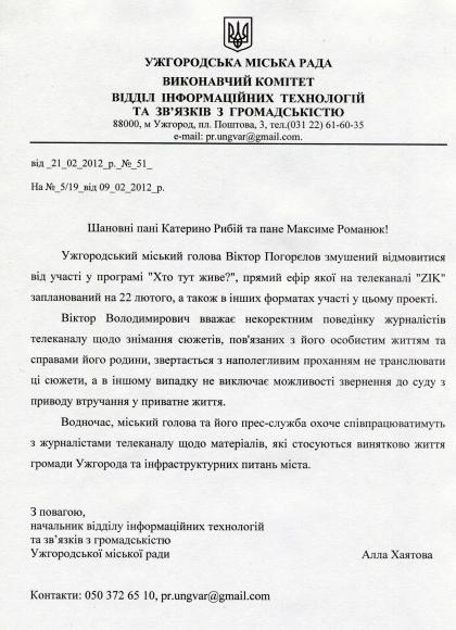 Віктор Погорєлов відмовився не лише брати участь у прямому ефірі «Хто тут живе?», але й від «інших форматів участі у цьому проекті». Каже, співпрацюватиме з журналістами телеканалу ZIK лише тоді, коли їхні матеріали стосуватимуться виключно життя громади Ужгорода та інфраструктурних питань міста.
