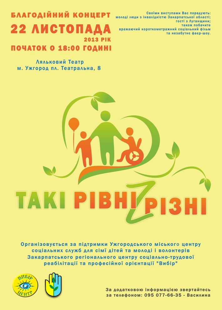 Захід організовують міський центр соціальних служб для сім’ї дітей та молоді з волонтерами Закарпатського регіонального центру соціально-трудової реабілітації та професійної орієнтації «Вибір». Мета заходу — сприяння формуванню у суспільстві позитивного ставлення до людей з інвалідністю. У концерті братимуть участь молоді люди з обмеженими можливостями та волонтери Закарпатської області,а також приїжджі гості з Києва та Луганська. Наприкінці концерту гості побачать фаер-шоу.
