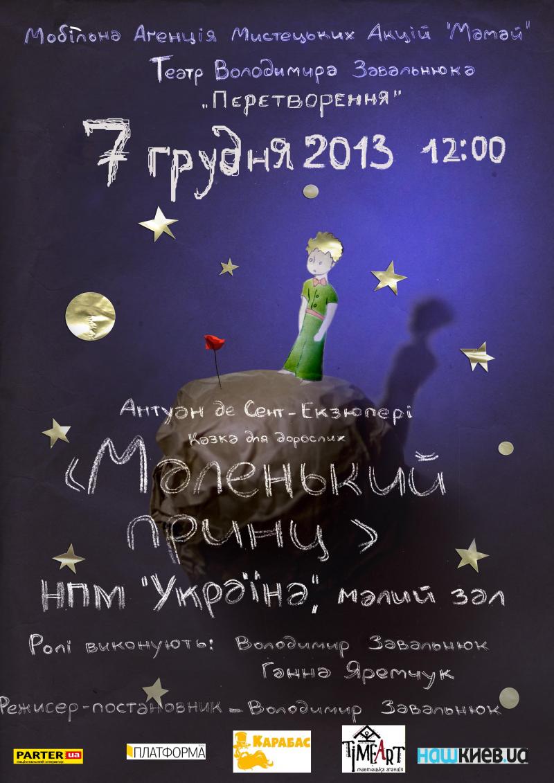 Квиток на виставу «Маленький принц» - це зворотний квиток в дитинство для кожного з тих, хто не покинув для себе в своєму дорослому житті світ довіри, захищеності та радості, супутній йому колись, хто пам'ятає і цінує свої початкові поняття про світ, речі та людях; і це запрошення для тих, хто тільки входить у життя, щоб зміцнити їх віру в те, що зірки сміються, серце здобуває перемогу над розумом, що є на світі Добро, зустрічний рух і відповідальність за тих, хто тобі повірив.