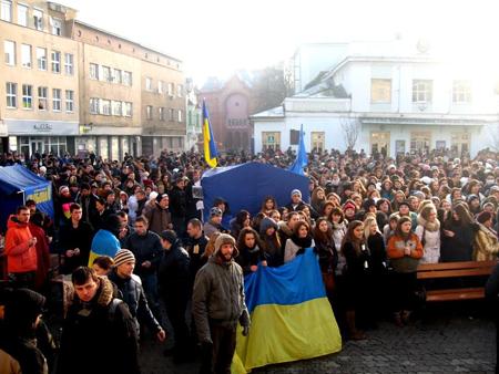 За кілька хвилин площа Театральна була вщент забита людьми. Більшість –студенти Ужгородського національного університету.