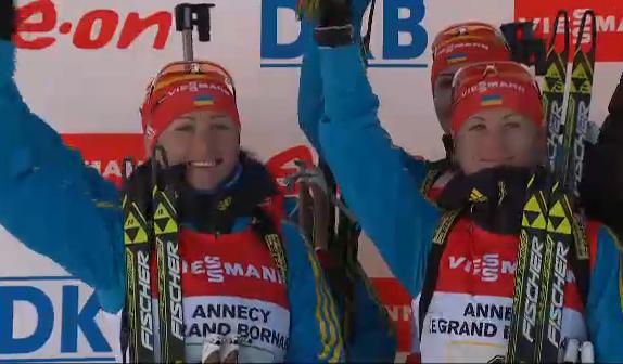 Першою за Україну бігла юна Юлія Джима. Юля відмінно відстрілялася на лежанні, але допустила три прикрих промахи в стійці й істотно відстала від лідируючої групи, передавши естафету Віті Семеренко тільки 9-ю.