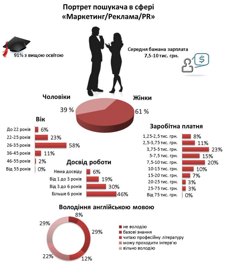 Тому нема нічого дивного в тому, що пошукачі в сфері «Маркетинг/Реклама/PR» володіють високими комунікативними і професійними якостями. І це та професійна сфера, в якій правлять жінки (двоє із трьох кандидатів — представниці прекрасної статі). Середній вік пошукачів складає 26-35 років, а в 91% кандидатів є вища освіта. Більшість пошукачів уже не новачки на ринку праці: майже половина має досвід роботи в середньому від 6 років і більше, а 3/4 кандидатів — більше 3 років.