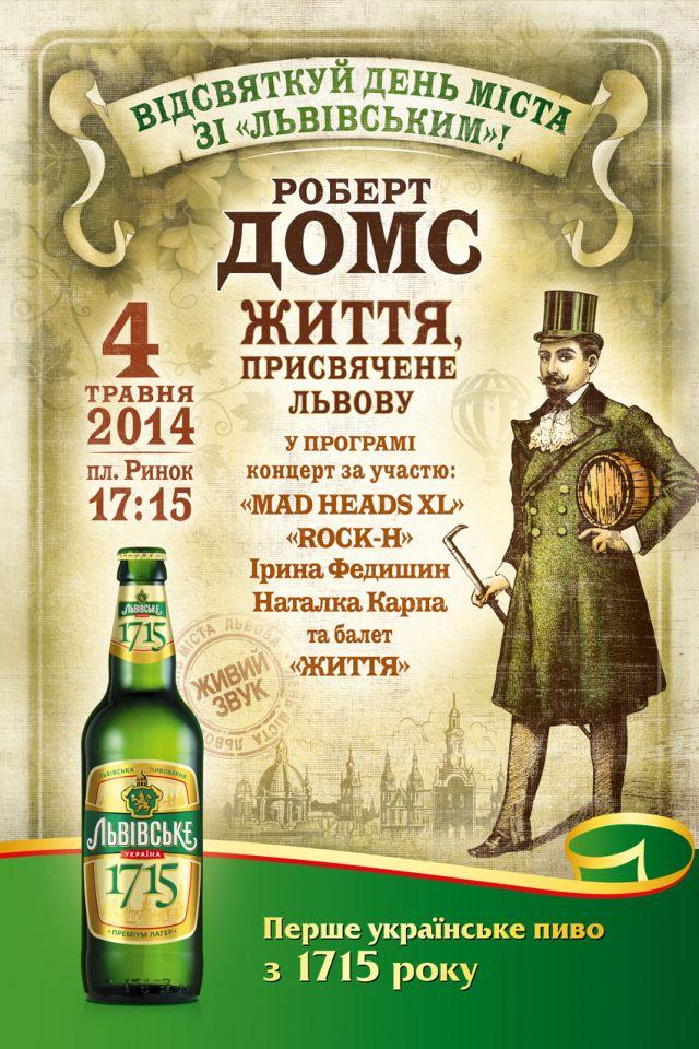 4 травня 2014 року стародавній Львів відзначить своє 758-річчя. За доброю традицією «Львівське», перше українське пиво, привітає рідне місто, провівши масштабний захід під назвою «Роберт Домс. Життя, присвячене Львову», у рамках якого буде представлений вражаючий музичний перформанс.