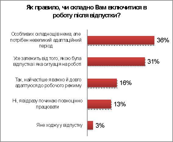 Проте навіть якщо відпустка вдалася, і на роботу повертаються, як на свято, все ж відразу включитися в роботу вдається тільки 13% респондентів. Для більшості просто необхідний невеликий адаптаційний період (про це сказали 36% опитаних). Для третини респондентів складнощі адаптації залежать від того, якою була відпустка і яка ситуація на роботі. А ось для 16% респондентів повернення на робоче місце — справжнє випробування.