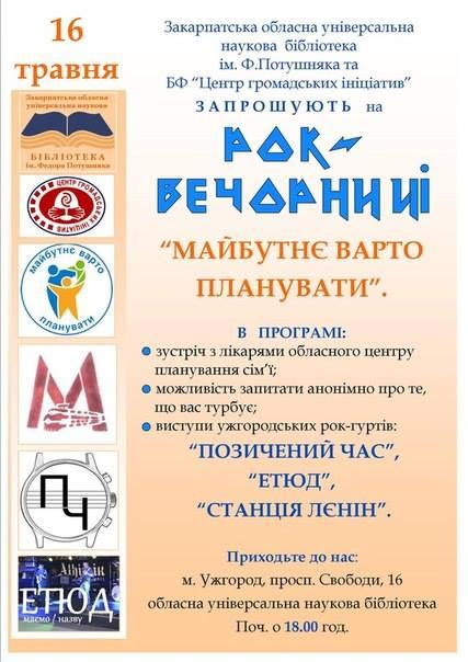 У програмі заходу буде зустріч з лікарями обласного центру планування сім’ї. Також всі охочі зможуть анонімно поставити питання. І найцікавішим етапом вечору будуть виступи ужгородських драйвових енергійних хлопців з рок-гуртів "Позичений час", "Етюд" та "Станція Лєнін".