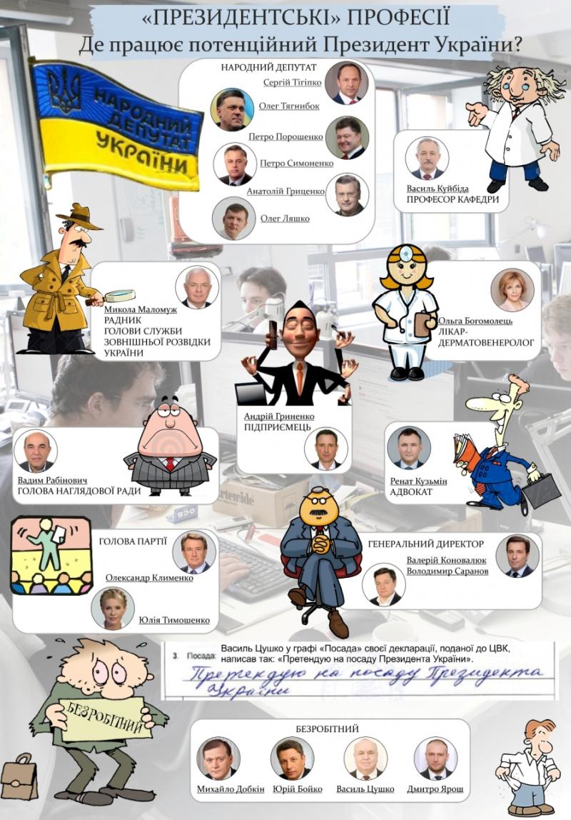 Як не дивно, серед кандидатів є і тимчасово непрацюючі. Один з них (Василь Цушко) у графі «Посада» своєї декларації, поданої до ЦВК, так і написав: «Претендую на посаду Президента України».
