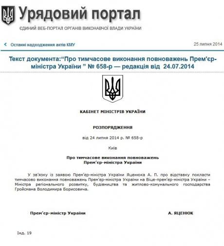 "У зв’язку із заявою прем’єр-міністра України Яценюка А. П. про відставку покласти тимчасово виконання повноважень прем’єр-міністра на віце-прем’єр-міністра – міністра регіонального розвитку, будівництва та житлово-комунального господарства Гройсмана Володимира Борисовича", - сказано в документі.