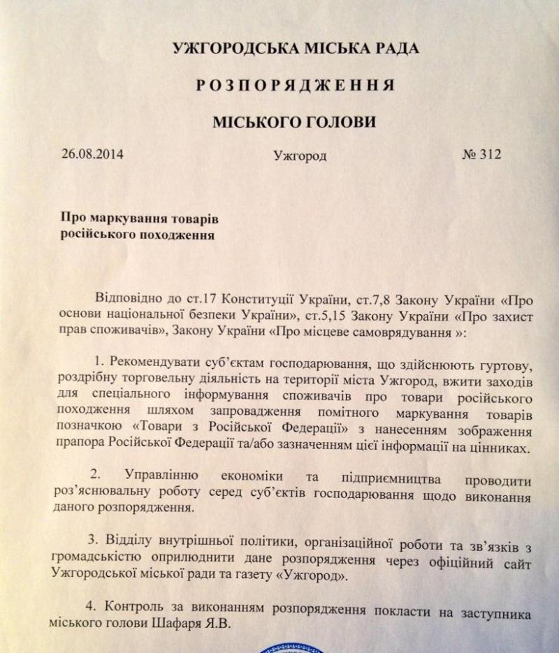 Сьогодні, 28 серпня, заступник міського голови Ужгорода Ярослав Шафарь опублікував на своїй сторінці у Facebook розпорядження про маркування товарів російського походження в Ужгороді.
