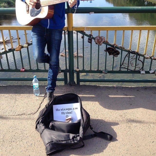 Сьогодні на пішохідному мості в Ужгороді можна спостерігати, як юні ужгородці грають на гітарі, та збирають гроші за свій талант ... на кіллера Путіну.