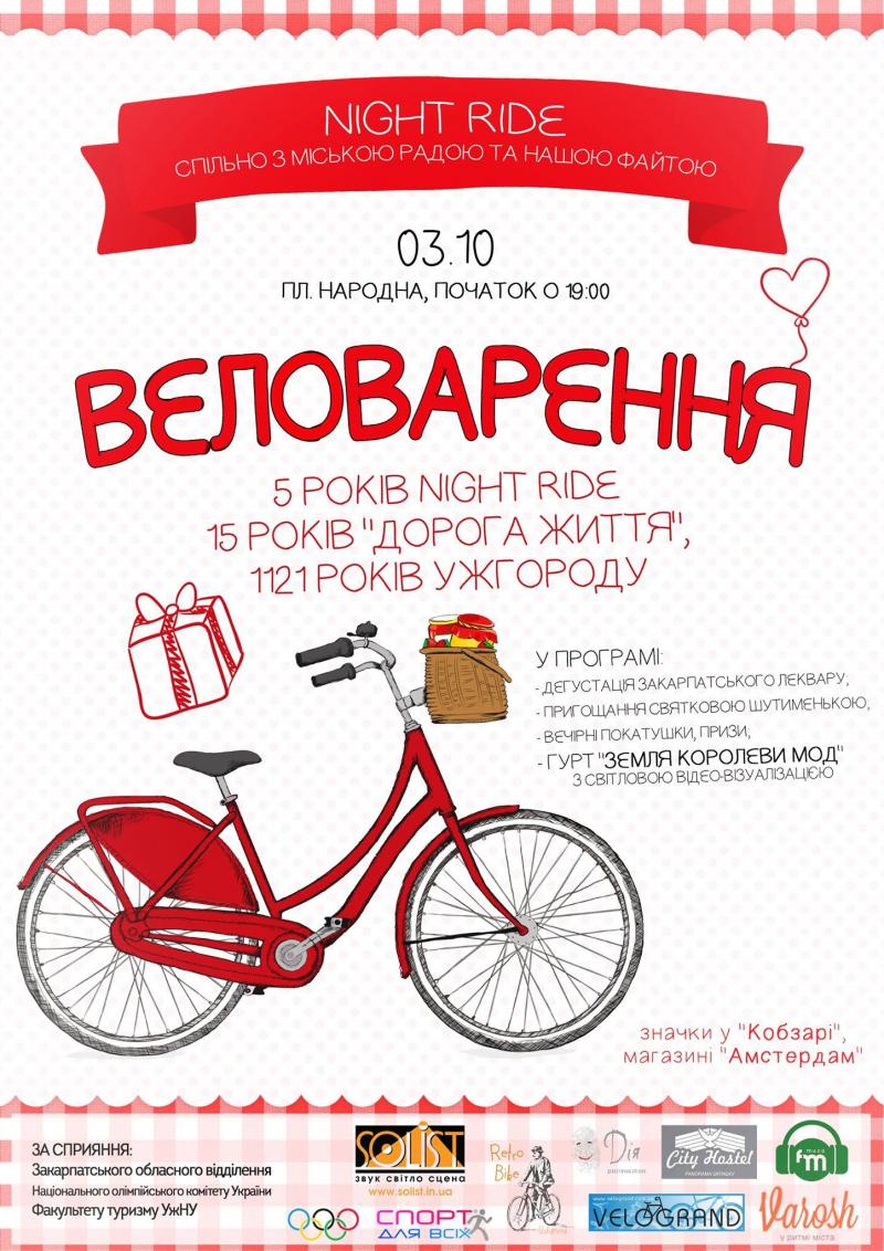 Цього разу тема покатушок - Веловарення. Власне, програма передбачає дегустацію закарпатського леквару, пригощання святковою шутименькою, призи, а гурт "Земля Королевы Мод" презентує світлову відеовізуалізацію.
