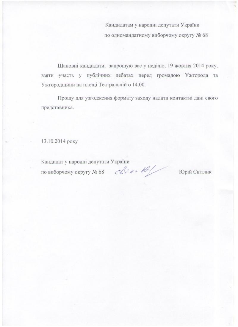 Кандидат у народні депутати України по виборчому округу №68 Юрій Світлик запрошує своїх опонентів на публічні дебати.