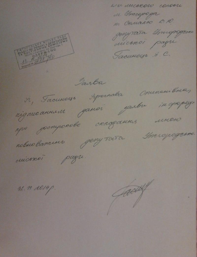 Депутат Ужгородської міської ради Ярослава Гасинець учора, 13 листопада, написала заяву на складання своїх депутатських повноважень.