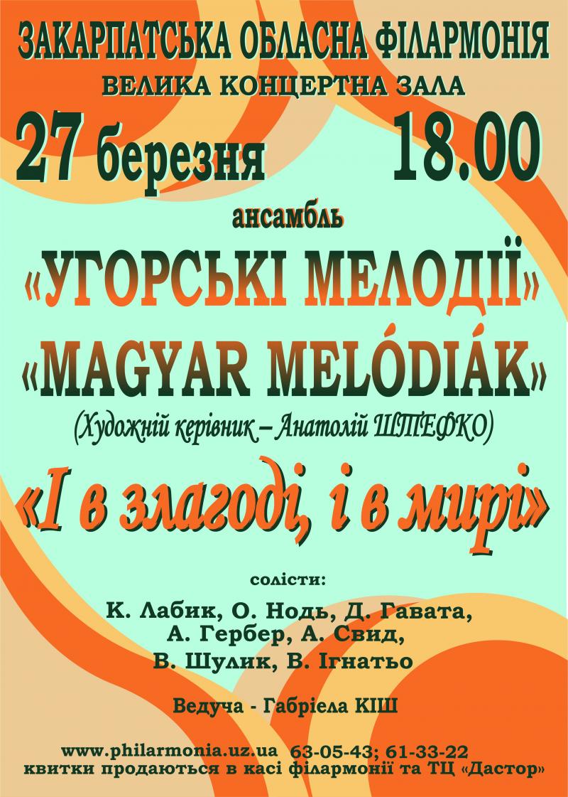 Отже, 27 березня, о 18.30 - камерно-інструментальний   ансамбль «Угорські мелодії» («MAGYAR MELÓDIÁK») Запрошує вас на програму "І В ЗЛАГОДІ, І В МИРІ"