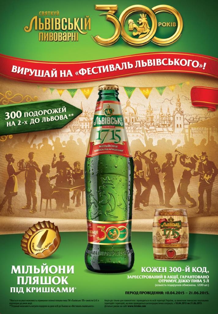 ТМ «Львівське» запрошує шанувальників справжнього українського пива разом відсвяткувати 300-річчя Львівської пивоварні. Стати частиною цієї знакової події дуже просто: потрібно лише взяти участь у новій промо-кампанії від пива «Львівське». Для цього необхідно придбати пиво «Львівське 1715» в акційних пляшках, знайти під кришкою унікальний код, надіслати його за допомогою sms на короткий номер 3200* або зареєструвати на сайті www.lvivske.com. Також учасники промо зможуть знайти кришечки з написом «Пляшка 0,45 л 2015 р.» та обміняти їх на пиво «Львівське 1715».