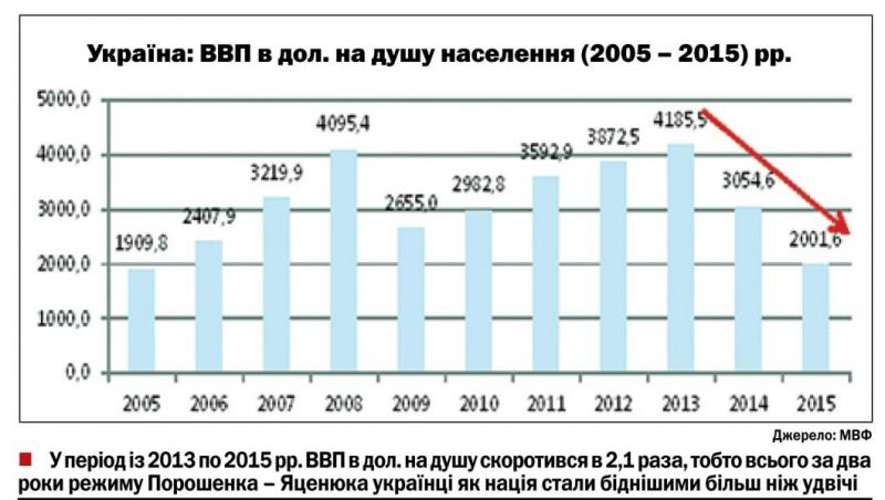 Насправді, як зазначають економісти, 2 тис. дол. на душу населення – це не межа, нас чекає ще більше скочування «в прірву», бо в 2015-му ВВП в доларах на душу впаде з урахуванням недавно погіршеного МВФ прогнозу падіння ВВП із «мінус» 5,5% до 9% й очікуваного дефолту України.