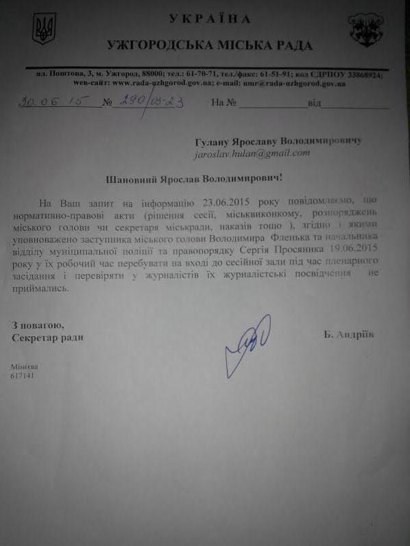 На що секретар Ужгородської міської ради Богдан Андріїв відповів – жодних нормативно-правових актів, якими було б уповноважено Фленька та Просянка у їх робочий час перебувати на вході до сесійної зали та перевіряти посвідчення, не приймалися.