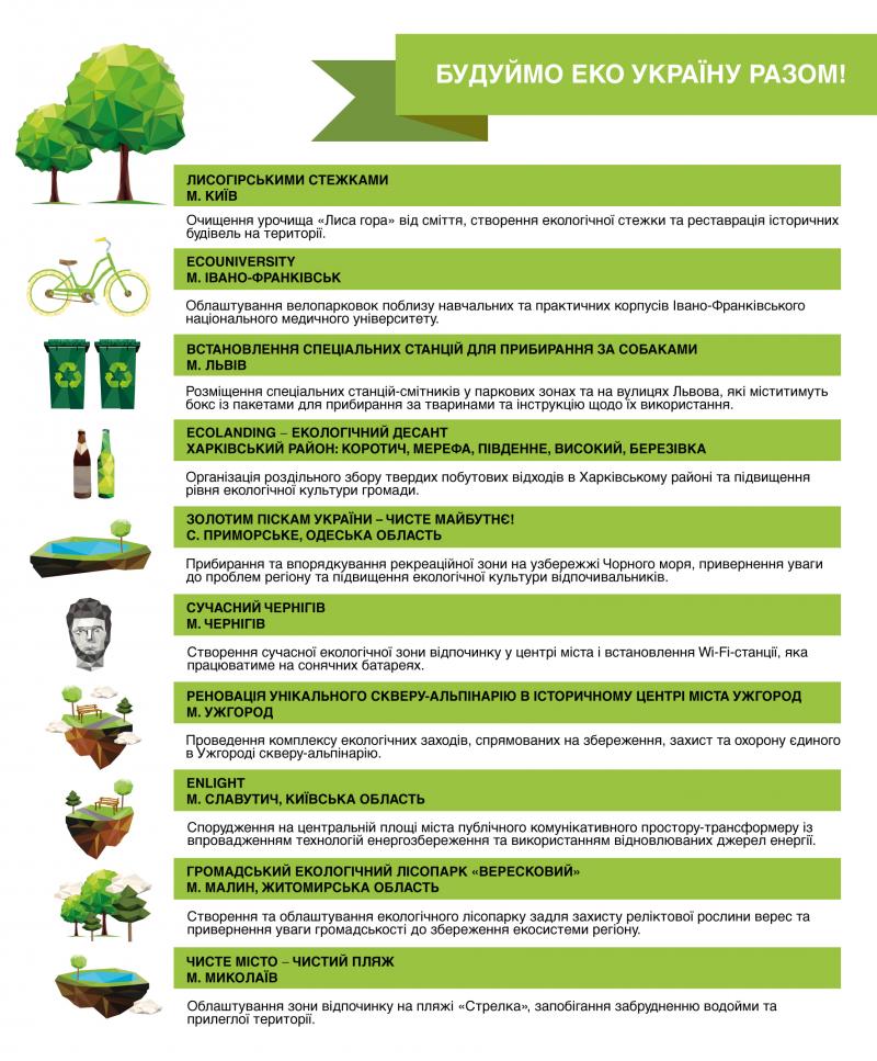Відзначимо, що більшість еко-ідей, які будуть реалізовані до кінця жовтня 2015 року, стосуються проблем енергозбереження, правильної утилізації та вторинної переробки відходів, очищення та облаштування водойм, а також популяризації еко-транспорту в Україні.