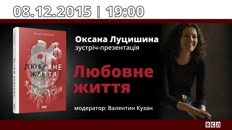 У вівторок, 8 грудня, о 19.00 у Мистецькому центрі «Галерея ІЛЬКО» знана письменниця-інтелектуалка Оксана Луцишина презентує свій новий довгоочікуваний роман «Любовне життя».