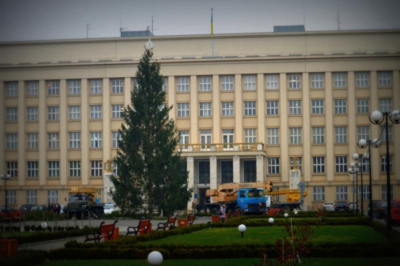 На площі перед будівлею облдержадміністрації встановлюють головну новорічну ялинку області.