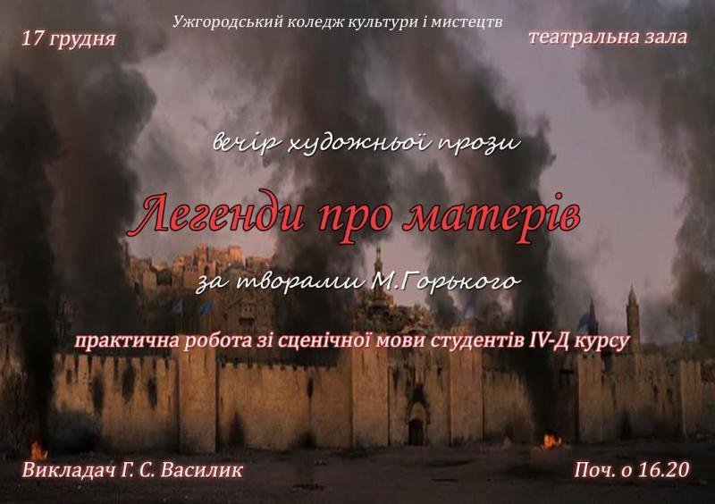 Студенти IV курсу режисерської спеціалізації (викладач – Г.С.Василик) запропонують глядачам літературно-музичну композицію за творами М.Горького «Легенди про матерів». В композицію ввійшло три італійські легенди, записані письменником на о. Капрі, які розповідають про матерів – жінок сильних, рішучих, люблячих, що здатні на найнеймовірніші вчинки задля своїх дітей і своєї Батьківщини.