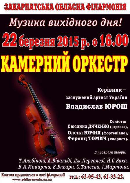 22 березня, о 16.00 великій залі Закарпатської обласної філармонії відбудеться концерт камерного оркестру філармонії.